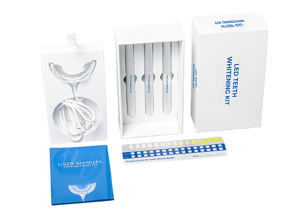 Your LED Teeth Whitening Kit includes 1 LED Mouthpiece, 12 gel pens for a 1 year supply and a shade chart to track your teeth whitening progress.